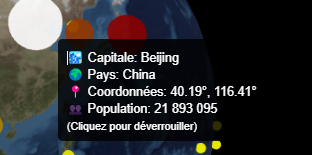Lorsqu’un utilisateur survole un marqueur, un effet de surbrillance se déclenche et un tooltip apparaît pour fournir des informations détaillées sur la capitale, telles que son nom, le pays, ses coordonnées géographiques et sa population. Les utilisateurs peuvent également verrouiller un marqueur en cliquant dessus, le maintenant ainsi en place.