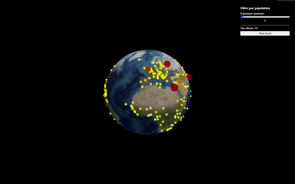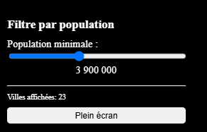 Enfin, un menu en haut à droite permet de filtrer les capitales selon leur population, et un bouton offre la possibilité de basculer en mode plein écran pour une expérience plus immersive.